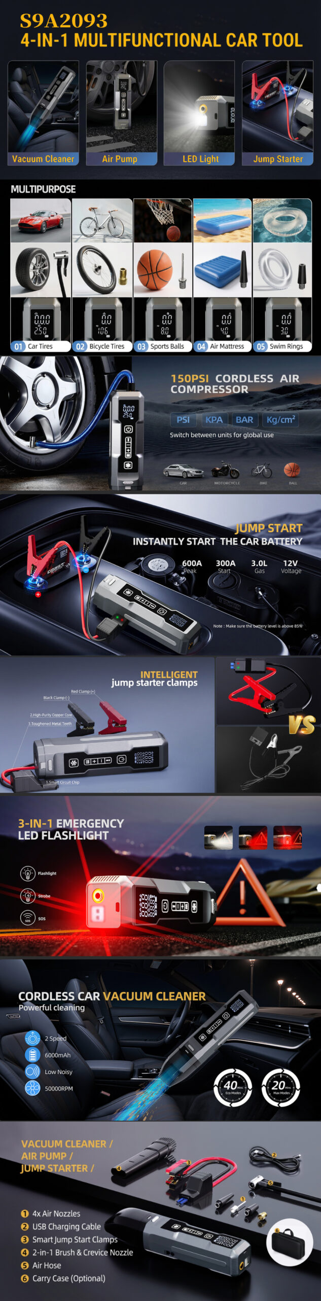 4-in-1 functionality – vacuum cleaner, air pump, LED light, and jump starter