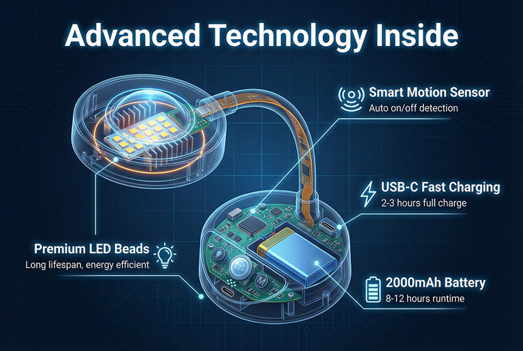 Built-in 2000mAh battery delivers 10h continuous light or 30 days in sensor mode, with USB-C fast charging to reduce e-waste.