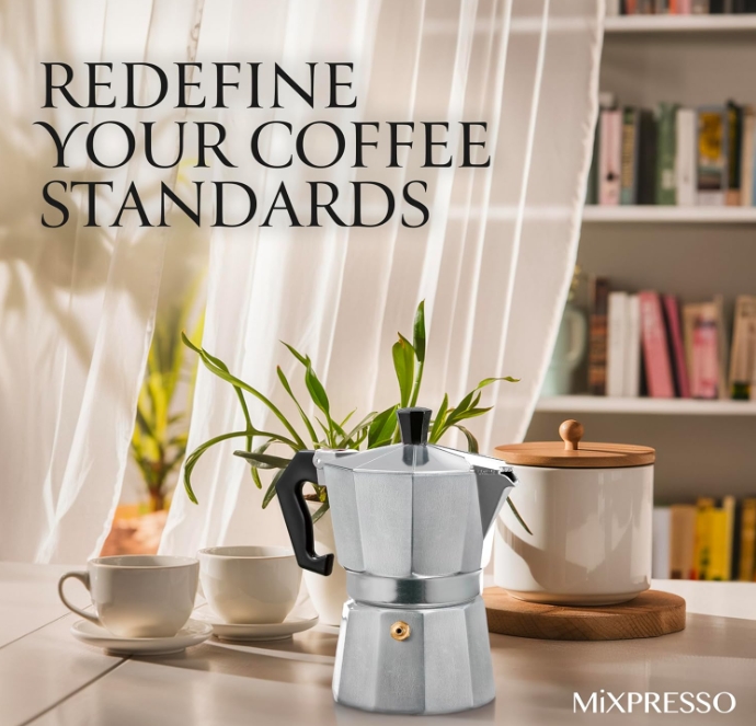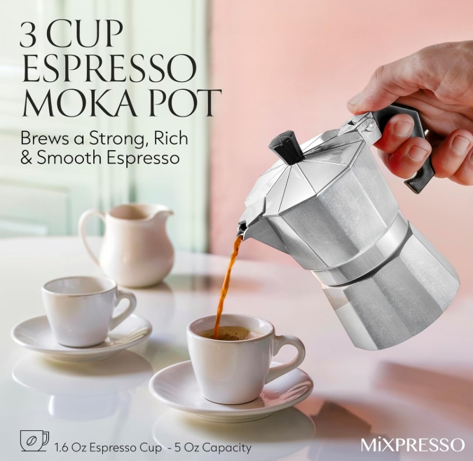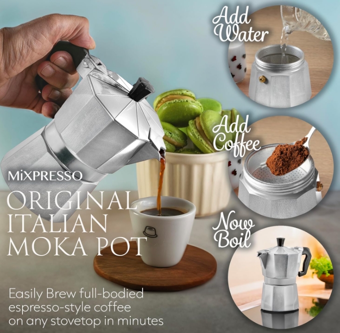 Saftey & Design Moka Pot: The Moka coffe maker, is made from a stylish and durable aluminum body to diffuse heat and enhance the coffee aroma. The espresso maker pot has a handle with a finger grip for secure handling.