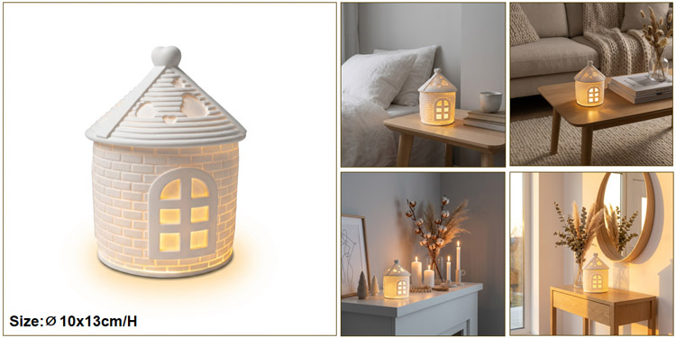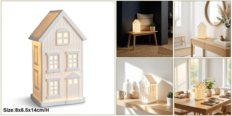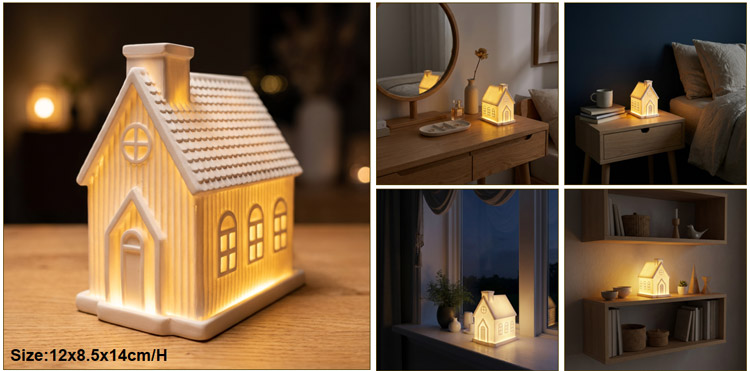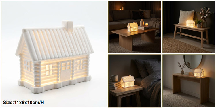 Handcrafted plaster cottage lamp creates warm, festive lighting—ideal for enhancing holiday decor and emotional ambiance.
