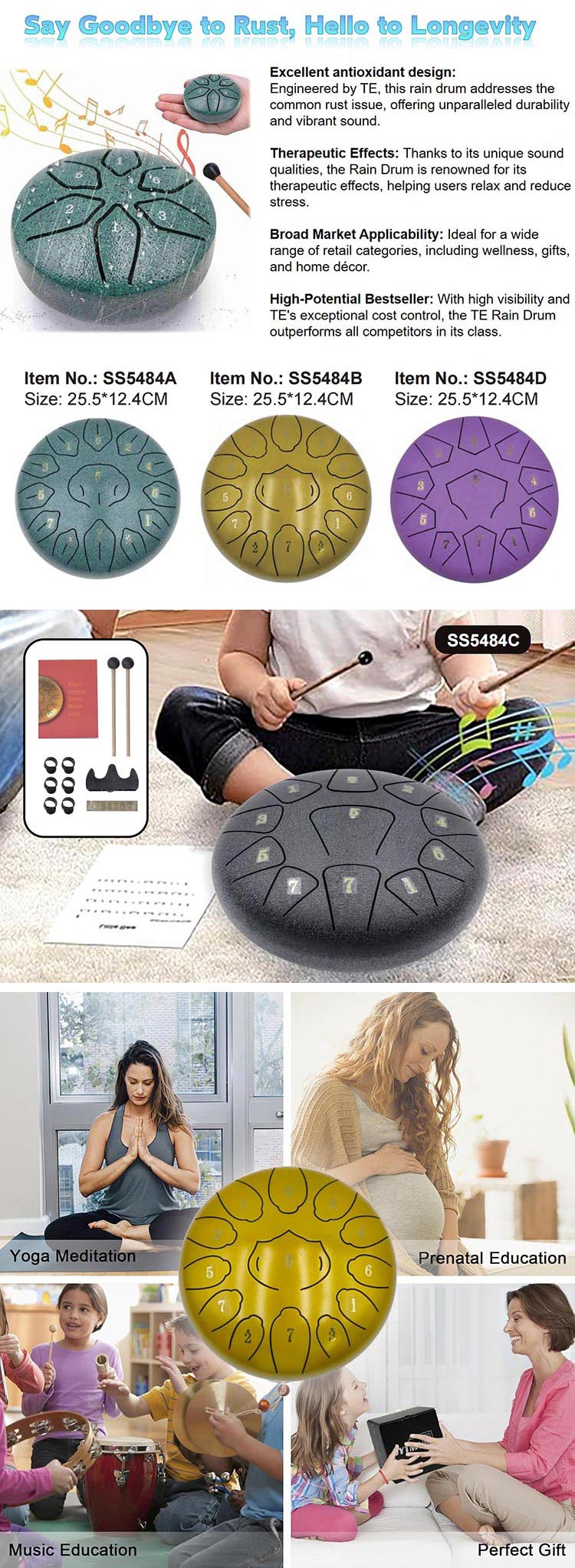| Description: Item name: Tongue Drum Item No.: SS5448/3inch,SS5441/6inch, SS5484/10inch MOQ: 1000PCS per design Unit price: Based on your qty., please send your inquiry by return, thanks. -Product Dimensions: Φ7.6*4.3HCM/3inch -Product Weight: 0.15KG -Material: Carbon Steel -Colors: Colorful, Green, Gold, Black(Custom color options) -Packaging: Kraft Paper Box Looking forward to hearing from you soon. Thanks and best regards, |